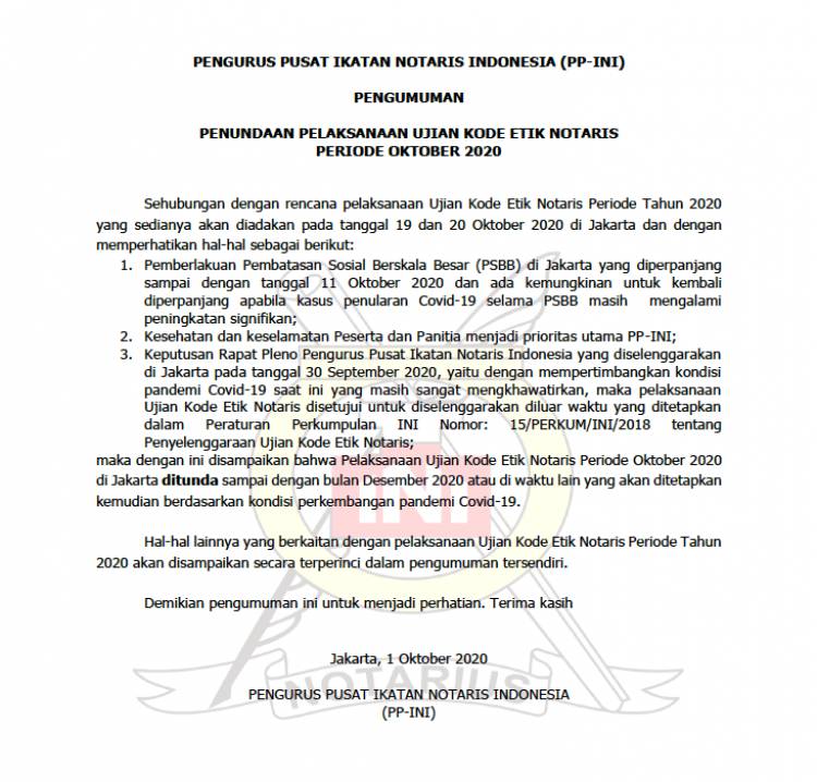 Pengumuman Penundaan Pelaksanaan Ujian Kode Etik Oktober 2020